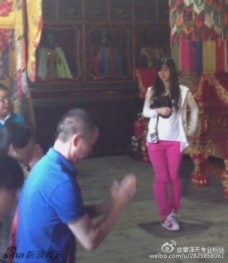 组图:奶茶妹章泽天陪父亲拜佛 长发运动装清纯