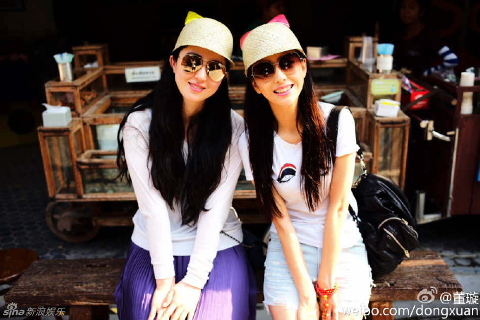 3月14日白色情人节,董璇在微博晒出和佟丽娅一起游泰国的照片,似双胞胎的两人穿上闺蜜装,一起做鬼脸拍美照。