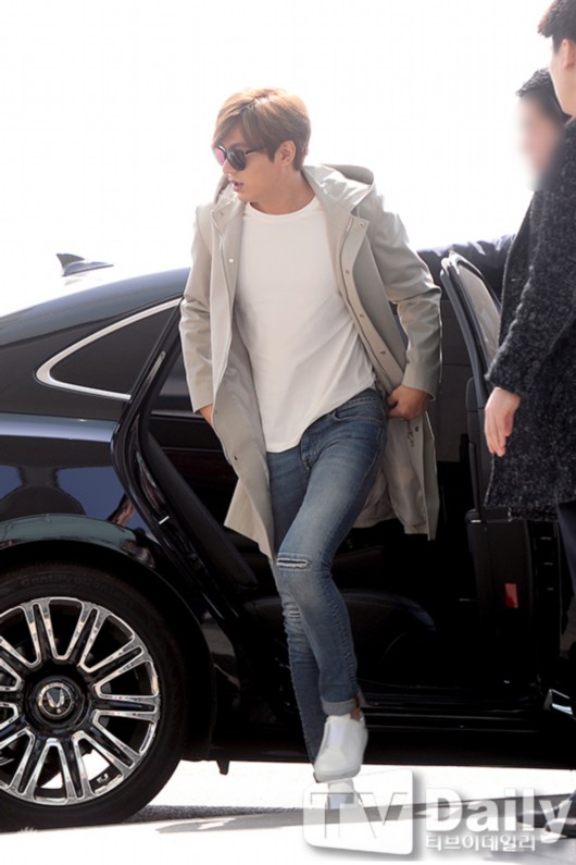 3月20日下午,韩国男星李敏镐为出席粉丝会搭机前往香港,身穿牛仔裤、T恤搭配浅色风衣演绎初春时尚。