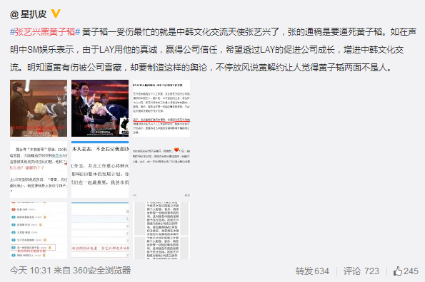 不过,这还不算什么,如今又有知名博主星扒皮爆出:“黄子韬一受伤最忙的就是中韩文化交流天使张艺兴了,张的通稿是要逼死黄子韬。如在声明中SM娱乐表示,由于LAY用他的真诚,赢得公司信任,希望透过LAY的促进公司成长,增进中韩文化交流。”