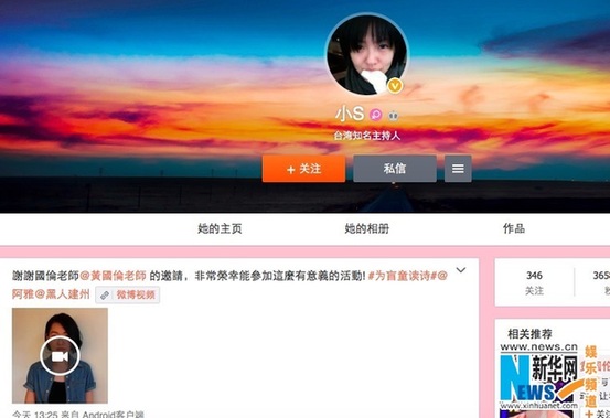 昨日,小S通过个人社交平台上传了一段朗诵唐诗《咏鹅》的短视频,视频上传不到三个小时,便引来了上万粉丝和网友的围观。多数网友表示,看惯小S《康熙》中的“疯颠”主持后,突然这样一本正经的通过公益活动为盲童读唐诗,真是怎么看怎么有喜感,仍然忍不住想笑。