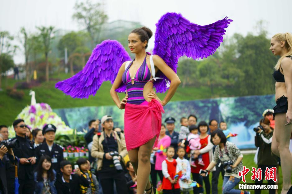2015年4月18日,湖北宜昌某房地产公司举办首届蝴蝶生态文化节促销楼盘,现场除了放飞上百万只世界珍稀的漂亮蝴蝶外,还邀请漂亮妩媚性感的外国模特,装扮成花蝶天使走秀,吸引众多市民围观。中新社发 周建平 摄