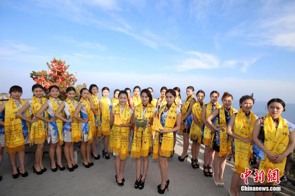 4月17日下午,2015国际旅游海峡两岸形象大使在河南洛阳海拔2000余米的老君山最高峰马鬃岭采集圣土,并庄重祈福,所采圣土将于10月份随着形象大使大陆选手赴台湾总决赛时,撒播在宝岛台湾。据了解,老君山为八百里伏牛山脉主峰,海拔2200米,相传因太上老君李耳在此归隐修炼而得名,具有2000多年的悠久道教文化历史。一些台湾民众每年都多次到河南老君山拜祖。其中有位7旬老人,每年都到老君山拜祖寻根,连续10年不间断。中新社发 王中举 摄