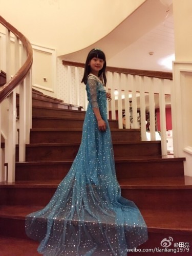 4月19日21点32分,田亮更新微博晒森碟美照,并戏称:“拖地长裙,女神范儿,穿上这个在家里跑了几圈,地板瞬间干净好多,真是好孩子。”照片中,森碟穿着蓝色拖地长裙,披着乌黑的长发,站在楼梯上回眸一笑,非常的漂亮,女神范十足。