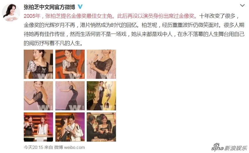 4月19日,香港金像奖举行。当晚,有粉丝晒出张柏芝十年前获金像奖最佳女演员的美照,并发文称“金像奖的光辉岁月不再”“柏芝经历重重波折仍微笑面对”。