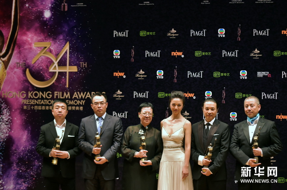 4月19日,电影《黄金时代》导演许鞍华(左三)、女主角汤唯(右三)等在颁奖典礼后的记者会上合影。新华社记者 何靖嘉 摄