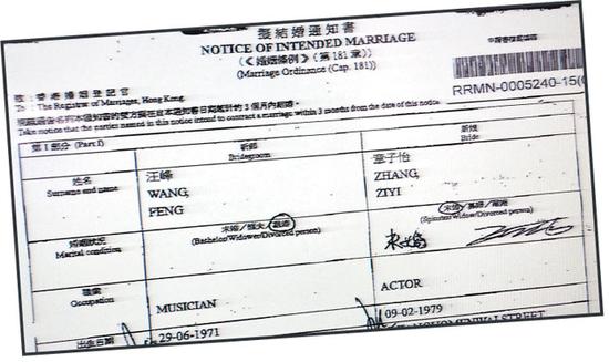 章子怡与汪峰3月29日秘密在香港递交拟结婚通知书。