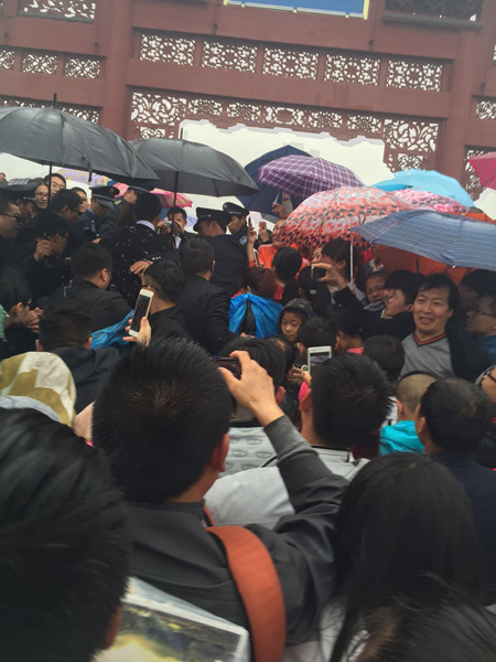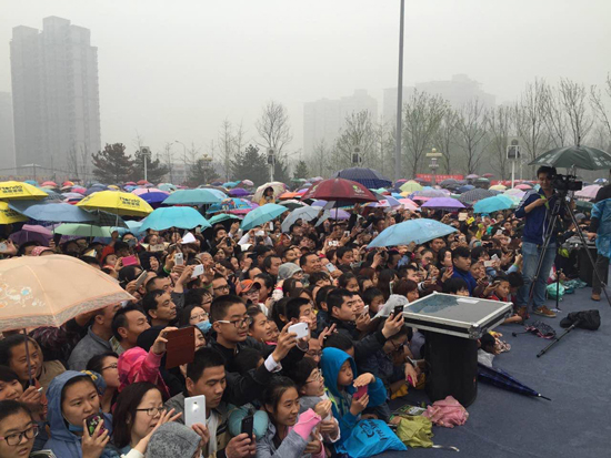 虽然天公不作美,但粉丝想迫切见到田亮的心情却丝毫没有减退,人们早早来到场地守候,甚至墙头和斜坡上也站满了群众。上午九点半,田亮以一袭黑色运动装帅气亮相,引起现场粉丝尖叫连连,纷纷说到:“田亮好帅啊,眼睛好亮!”“田亮比电视上还帅!”大家争相拿出手机拍照,快门声络绎不绝。
