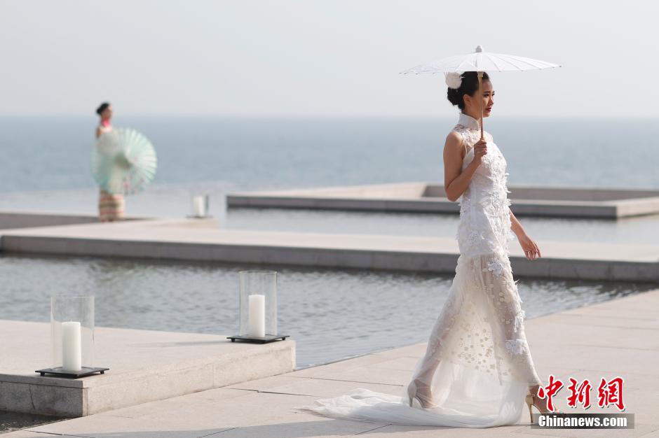 4月27日,2015(青岛)国际时装周,模特在露天T台上展示设计师高丽新设计的旗袍。当日,高丽新《茉莉·吟》2015年旗袍发布会在青岛举行。中新社发 盛佳鹏 摄