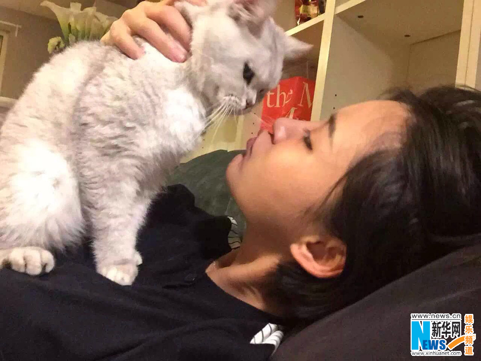张歆艺开启与猫咪秀恩爱模式 大玩亲亲