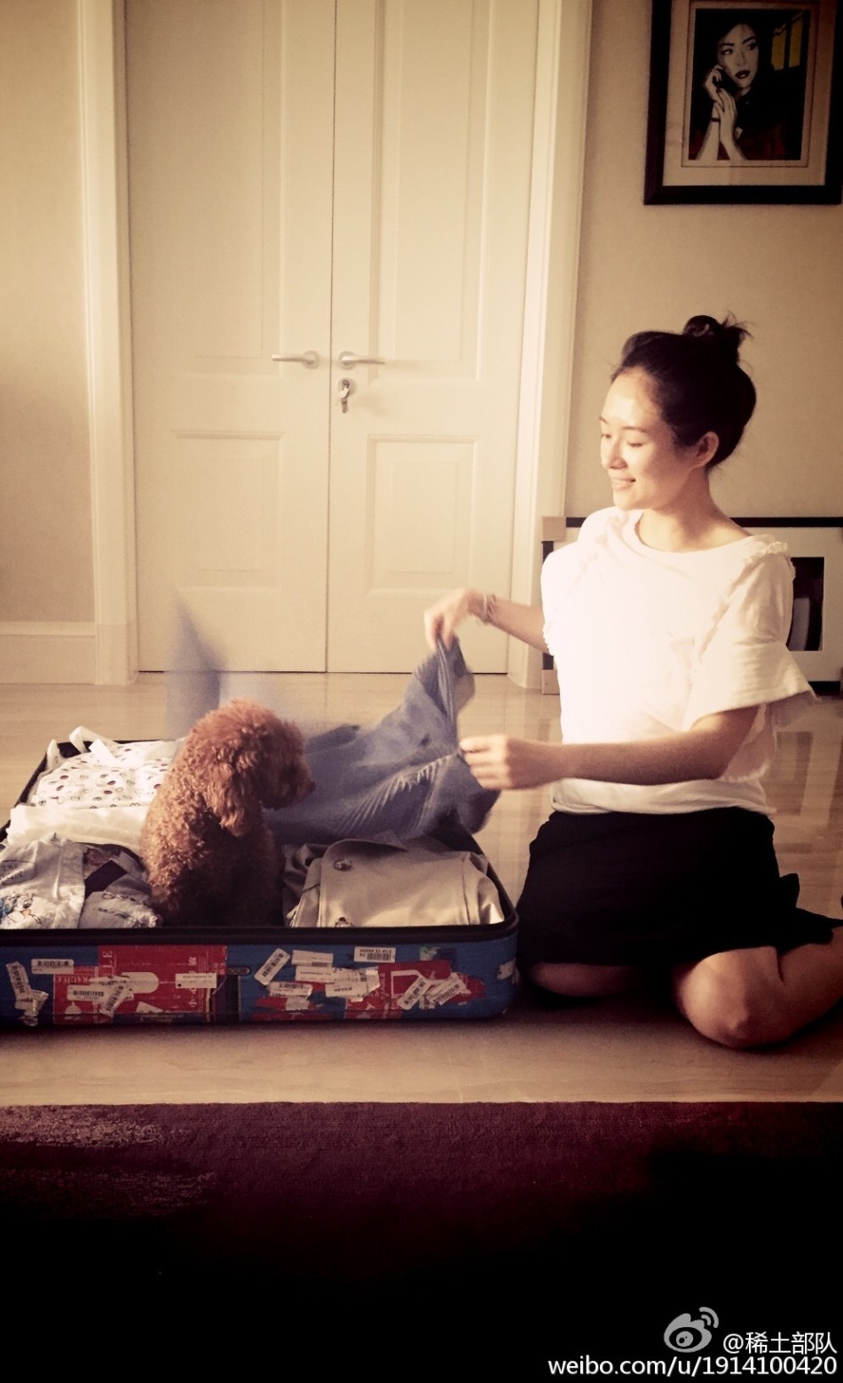 章子怡在微博晒出收拾行李将要出国的美照。爱犬在一旁和女神玩耍,卖萌停不下来。而章子怡的居家打扮多了几分慵懒,丸子头俏皮似少女。