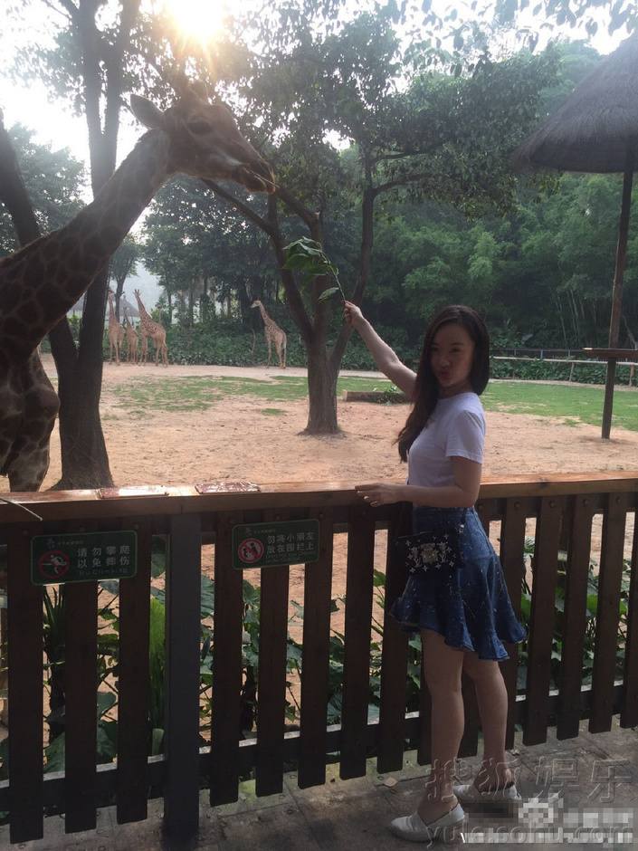 霍思燕清凉装与长颈鹿甜笑合影 霍爸罕见出镜