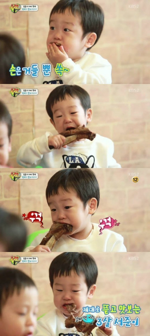 节目中,四组家庭来到了济州岛旅行。李辉才戴着双胞胎儿子和严泰雄父女一起在海边玩耍后来到餐厅吃晚饭。李辉才将整块排骨递给了书言与书俊,两兄弟抱着比自己脸还大的排骨正式下嘴。书俊张嘴-撕肉-填满-咀嚼-下咽,动作一气呵成,让李辉才也吃惊不已。