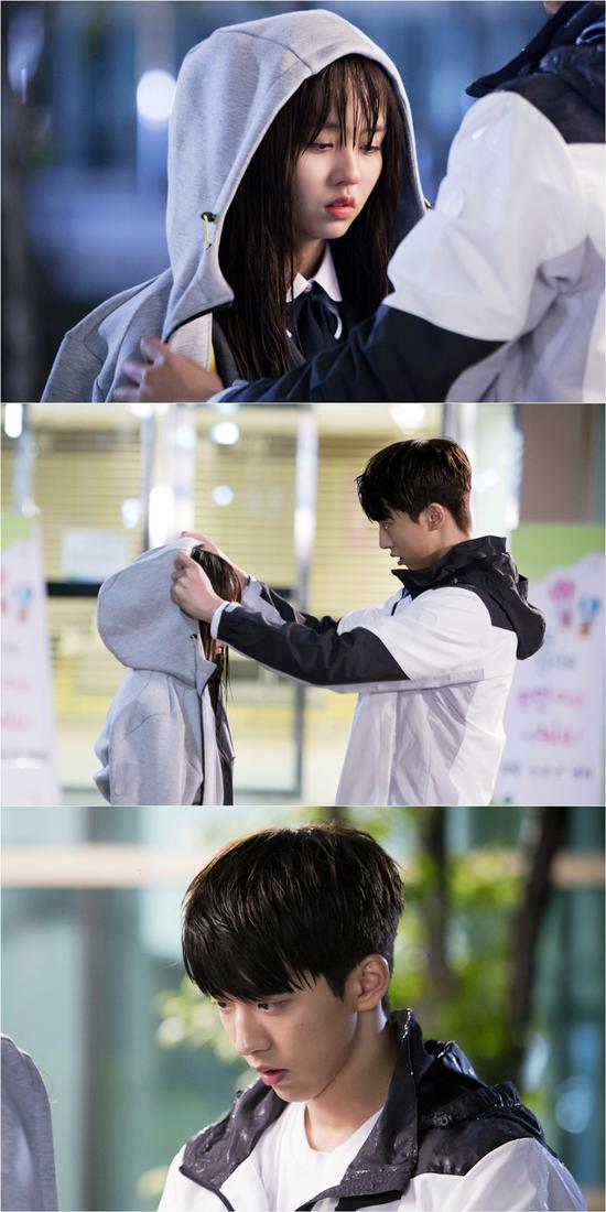 在公开的照片中,不知道为何浑身湿透的金所炫和南柱赫相对而立。南柱赫把自己的卫衣套到金所炫身上,还贴心地给金所炫戴好帽子,细心温柔的样子让女观众们心动不已。而金所炫不肯直视南柱赫又若有所思的样子,也让观众们很好奇他们之间到底发生了什么事情。