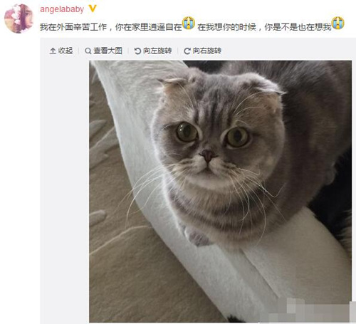 不过随着高人气所带来满满片约以及代言等活动,导致她极少时间回家。今天中午她在微博晒出好多张爱猫照片,并说:“我在外面辛苦工作,你在家里逍遥自在,在我想你的时候,你是不是也在想我…”但网友替黄晓明感到醋味,“他竟不如一只喵星人”!