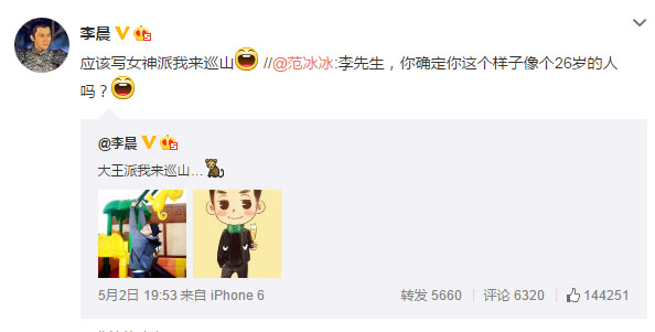 5月2日晚,李晨贴出一张卖萌照,在其中他背着小书包,举起猴子造型的木马,并配文写道:“大王派我来巡山。”隔了一天,范冰冰突然转播评论道:“李先生,你确定你这个样子像个26岁的人吗?”(小编才不会告诉你,李晨其实今年是36岁)看到女方主动转播,李晨赶紧回应:“应该写女神派我来巡山。”两人之间的粉红溢于言表。
