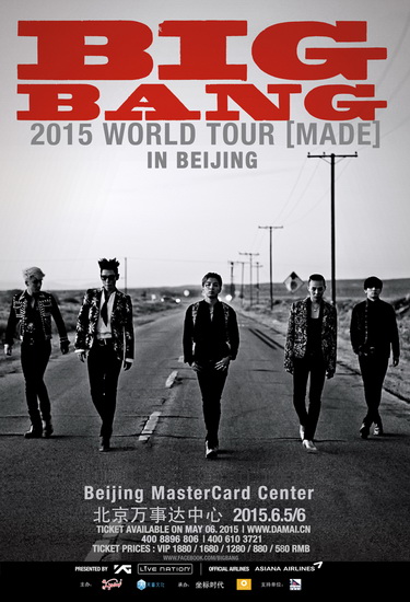由银河世界娱乐有限公司及天喜文化传播(天津)有限公司主办的BIGBANG 2015世界巡演北京站,即将于2015年6月5日、6日在万事达中心上演,并于今天进行了两场门票预售。两场门票分别在短短10分钟、15分钟内被抢购一空,创下惊人的销售记录。前不久广州站门票也同样被迅速秒杀。
