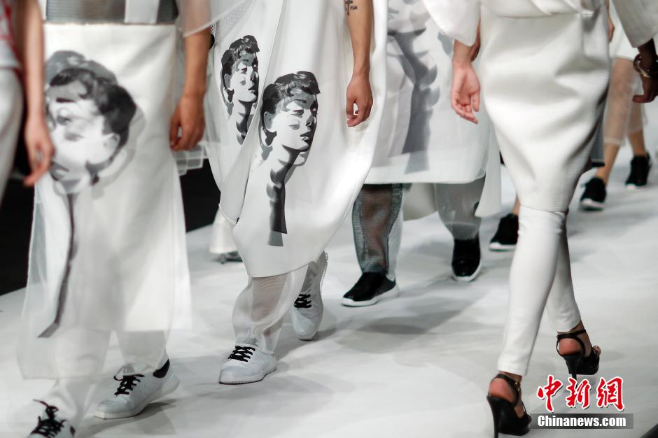 5月19日,模特在T台上展示中华女子学院艺术学院毕业生设计的时装作品。此次中华女子学院毕业生作品发布的主题是“物悟合一”。中新社发 盛佳鹏 摄