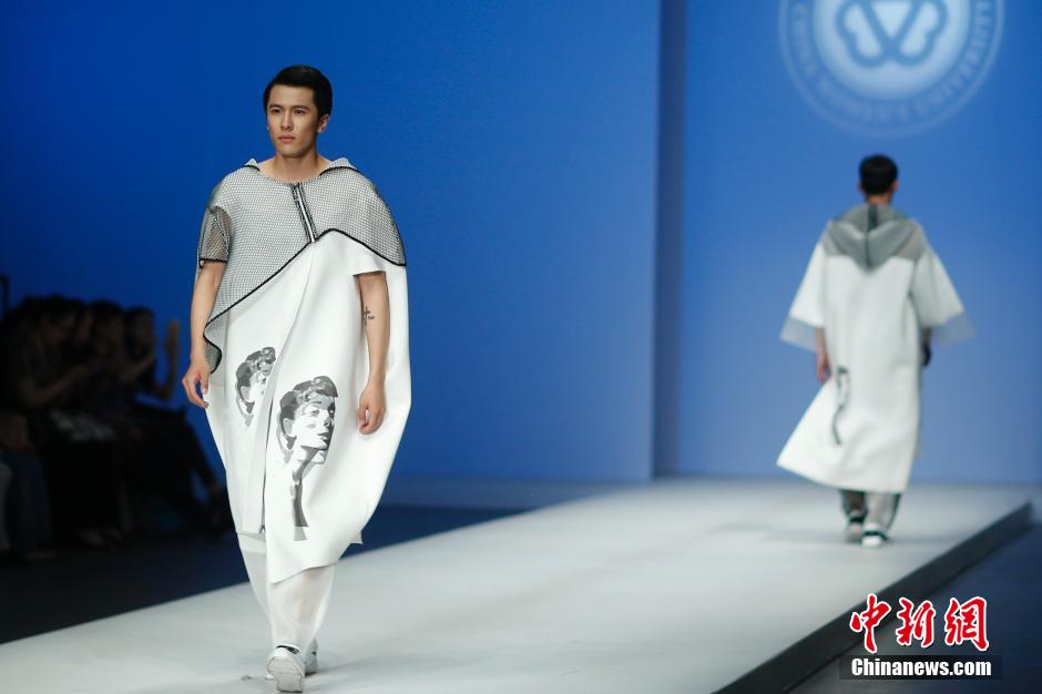 5月19日,模特在T台上展示中华女子学院艺术学院毕业生设计的时装作品。此次中华女子学院毕业生作品发布的主题是“物悟合一”。中新社发 盛佳鹏 摄
