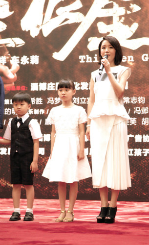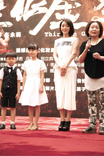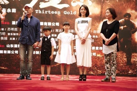 昨日,由导演姚言执导,著名演员车永莉、李易祥主演的“国庆65周年献礼影片”《十三根金条》在人民大会堂举行新闻发布会暨首映礼。正在外地赶拍另一部巨制电影《大轰炸》的车永莉特意请假回京参加,并坦言自己在片中是首次诠释母亲角色,尤其是谈及最难忘的与戏中母子情深的心酸互动,更是一度哽咽,感动在场观众。
