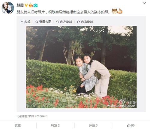 昨日(5月31日),赵薇在微博晒出朋友给她发来的旧照,照片中,她身穿格子衬衫,黑色裤子,半蹲着被女性友人从背后抱住,满脸灿烂笑容。她还留言称“朋友发来旧时照片,很欣喜居然能摆出这么雷人的姿态拍照。”