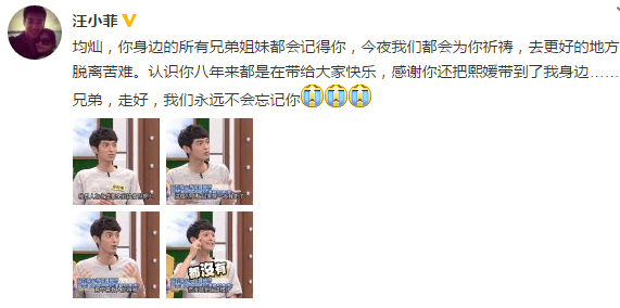 随后,汪小菲发文悼念安钧璨,并晒出安钧璨近日录制康熙的画面。汪小菲写到:“均灿(钧璨),你身边的所有兄弟姐妹都会记得你,今夜我们都会为你祈祷,去更好的地方脱离苦难。认识你八年来都是在带给大家快乐,感谢你还把熙媛带到了我身边……兄弟,走好,我们永远不会忘记你。”