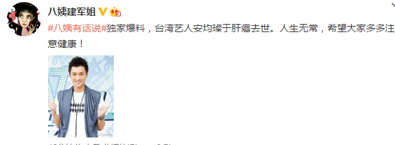 6月1日凌晨,微博名为“八姨建军姐”爆料称:“台湾艺人安均璨于肝癌去世。人生无常,希望大家多多注意健康!”