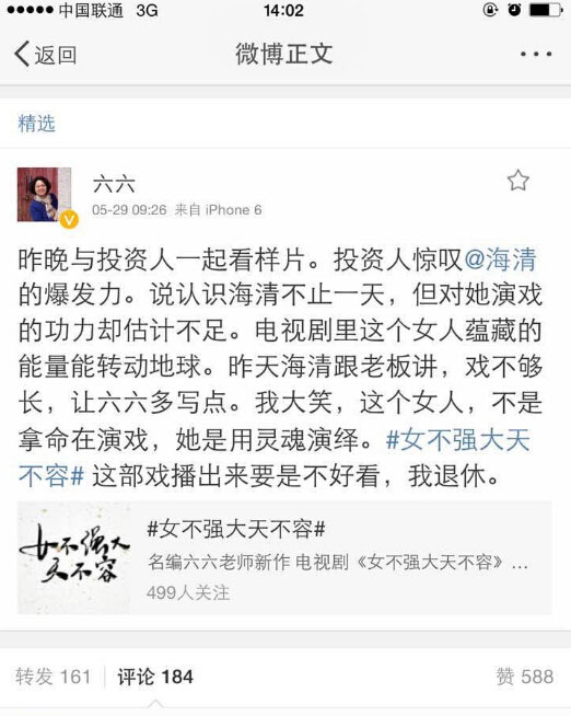 不过海清玩命儿的拍摄也换来了六六的肯定,昨日六六在微博表示:“昨晚与投资人一起看样片。投资人惊叹海清的爆发力。说认识海清不止一天,但对她演戏的功力却估计不足。电视剧里这个女人蕴藏的能量能转动地球。昨天海清跟老板讲,戏不够长,让六六多写点。我大笑,这个女人,不是拿命在演戏,她是用灵魂演绎。”最后,六六更是自信的扬言:“这部戏播出来要是不好看,我退休!”