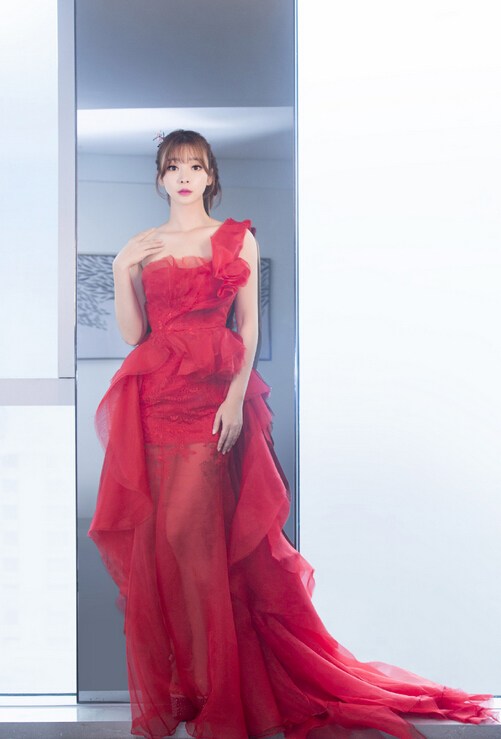 柳岩身穿红色礼服大秀香肩美背
