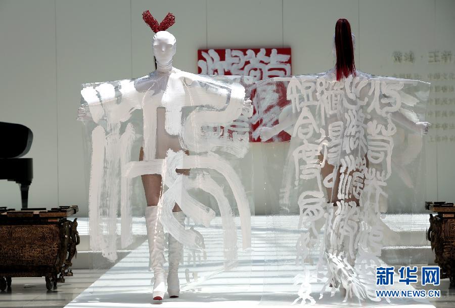 7月28日,模特在“惊鸿——王新元书法篆刻艺术展”上演绎时装设计师王新元创作的“篆书时装”。当日,融汇时装、音乐、书法、篆刻等艺术表现形式的新媒体跨界组合展“惊鸿——王新元书法篆刻艺术展”在浙江杭州展出。著名时装设计师王新元创作的“篆书时装”为传统书法艺术增添时代气息和现代精神。新华社记者 李明放 摄