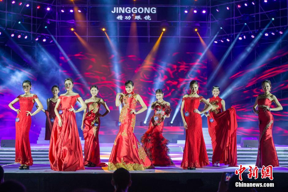 选手们正在进行晚装环节的展示。 中新社发 骆云飞 摄