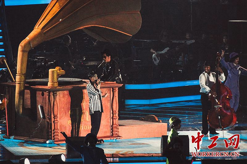 首轮导师与学员合唱中,用自己演唱会给学员热身的周杰伦,先是与嘻哈女学员陈梓童一起带来嗨翻全场的 《鞋子特大号组合曲》。欢快弹钢琴的周杰伦和穿着大鞋子的陈梓童,将一系列“周氏经典”巧妙融合,并借用舞台影像再次向卓别林致敬,复古混搭风十分浓郁。 中工网记者 张起晨摄