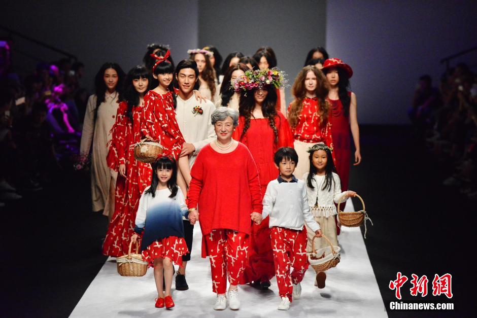 10月19日,上海新天地太平湖。上海时装周2016春夏作品展示上,模特在展示以棉麻材质为主的中国本土设计师品牌“茵曼”新作。在现场,儿童模特与奶奶级模特携手走秀,别具一格。 中新社记者 袁婧 摄