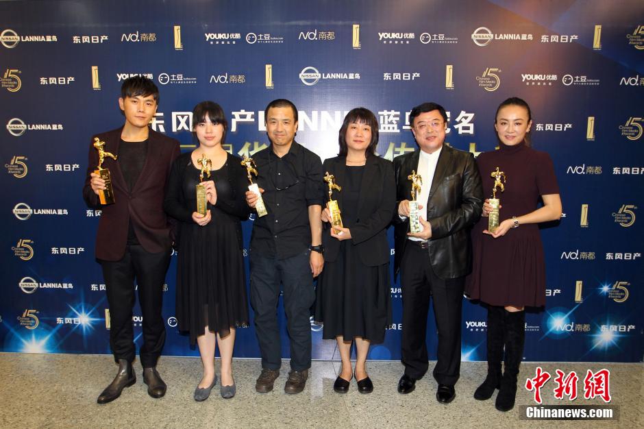 第十五届华语电影传媒大奖10月31日晚间在广州塔揭晓,由娄烨(左三)导演的《推拿》狂揽包括最佳电影、最佳导演、最佳编剧、最佳男主角、最佳女配角、最佳新演员共6奖,成为当晚最大赢家。