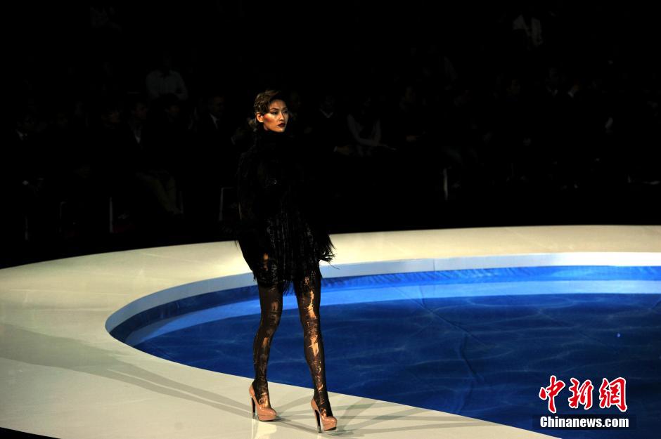 12月14日晚,2015年第四届武汉时装周在武汉国际会展中心举行闭幕式,闭幕式上来自法国高级定制设计师Eric作品发布秀、“汉工场”发布秀以及武汉服装“创二代”作品发布秀展示了中外服装设计师对于时尚的不同演绎。5天的武汉国际时装周共19场服装秀给江城武汉市民展示不同的时尚魅力。图为模特展示时装作品。 中新社记者 张畅 摄