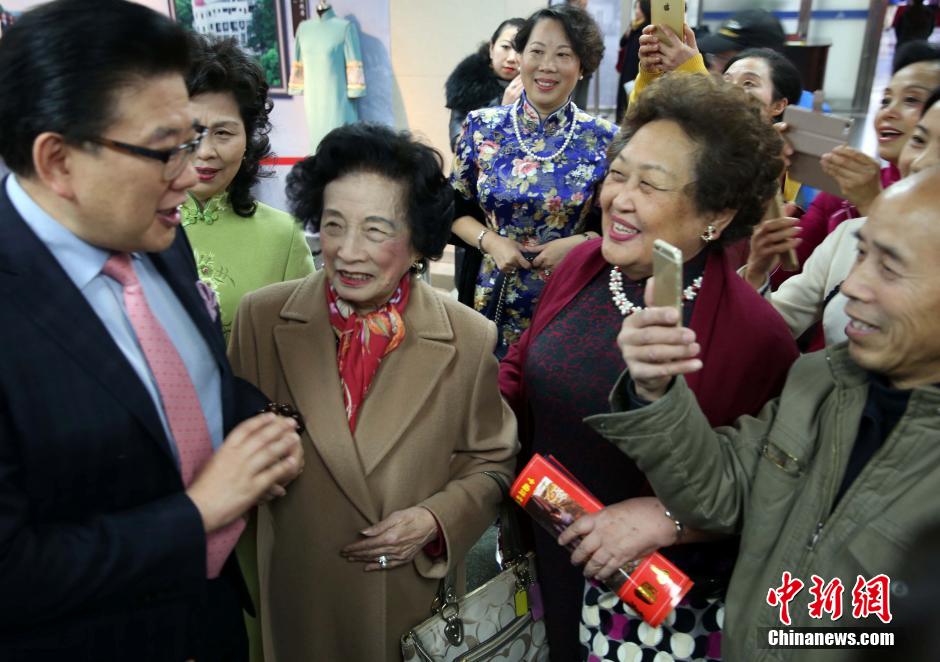图为九旬上海舞后(左二)在展览中吸引粉丝。潘索菲 摄