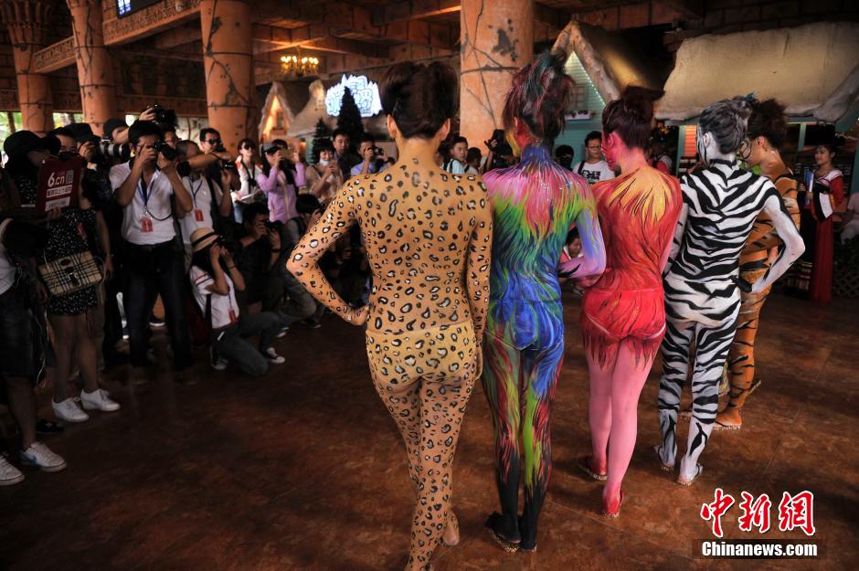 美女通过人体彩绘装扮成各种动物吸引众多游客观看。 陈超 摄
