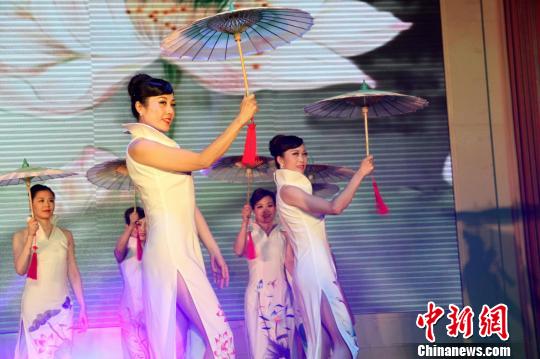 江苏省旗袍会巾帼佳丽身着旗袍表演大型旗袍秀《水墨江南》。 崔佳明 摄