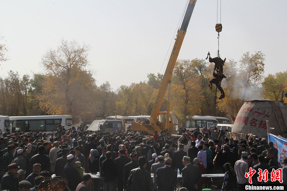10月23日,新疆巴楚县第四届胡杨文化旅游节开幕,该县的胡杨岛上巴楚县美食节亦同时迎客。新疆巴楚县烤肉王、家族第5代传人明吾甫尔当天在自己制作的馕坑里烤出一峰重350公斤的全骆驼。图为游客抢购骆驼肉。中新社发 朱景朝 摄