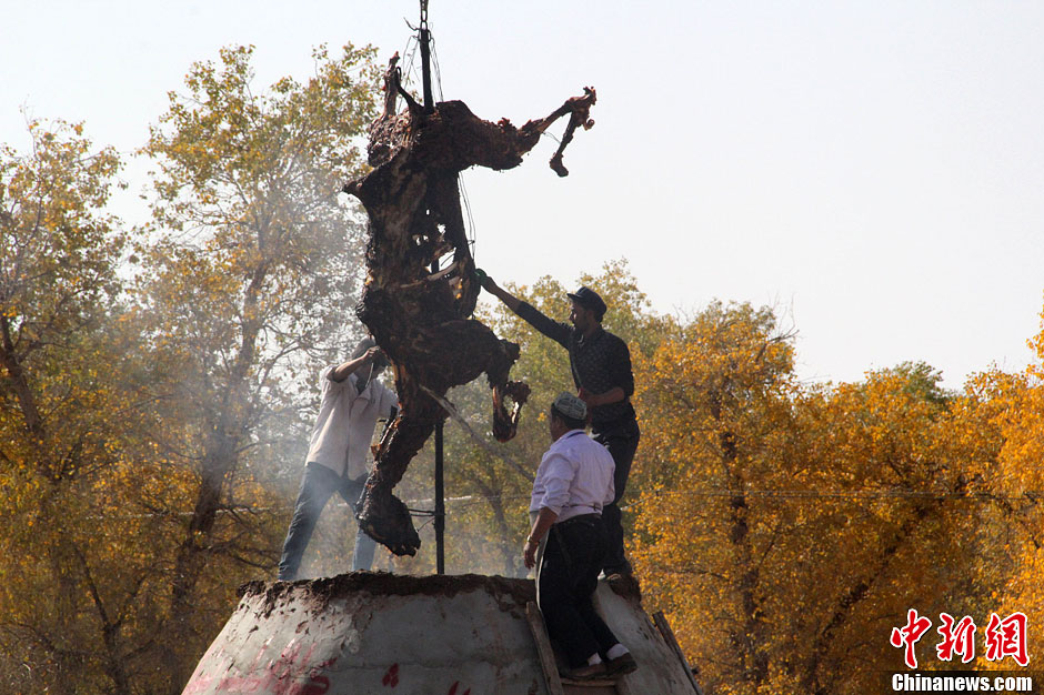 10月23日,新疆巴楚县第四届胡杨文化旅游节开幕,该县的胡杨岛上巴楚县美食节亦同时迎客。新疆巴楚县烤肉王、家族第5代传人明吾甫尔当天在自己制作的馕坑里烤出一峰重350公斤的全骆驼。图为游客抢购骆驼肉。中新社发 朱景朝 摄