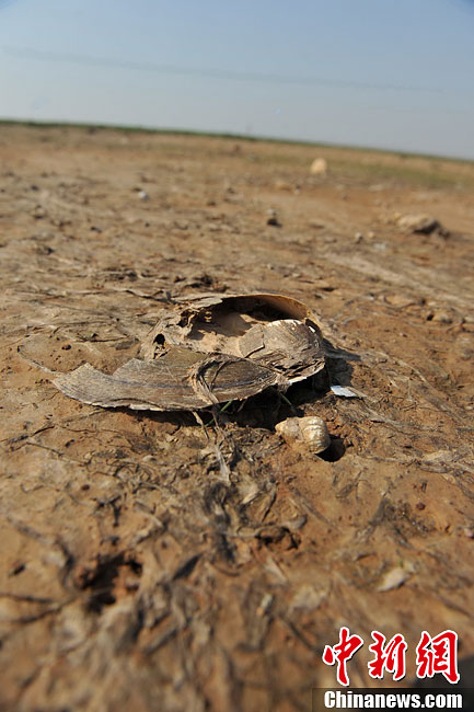连日来,受长江低水位和江西境内降雨偏少的影响,中国最大淡水湖鄱阳湖提前进入枯水期。11月19日,在江西省永修县吴城镇鄱阳湖水域,丰水期水天一色的湖面,现在已经成了茫茫“草原”。“草原”上,鹭鸟翩飞,构成一幅鄱阳湖特有的初冬壮美画卷。图为一只死亡的河蚌躺在鄱阳湖湖床上。刘占昆 摄