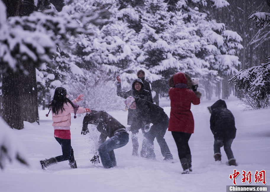 连续几日的大雪为长春大地披上一层厚厚的银装,虽然降雪给当地市民生活带来很多不便,但也有很多人能够雪中取乐。堆雪人、打雪仗、滑雪……随着降雪的减小,长春市民开始体验冬季独有的雪趣。图为市民在公园内打起雪仗,忘情的体验雪趣。张瑶 摄