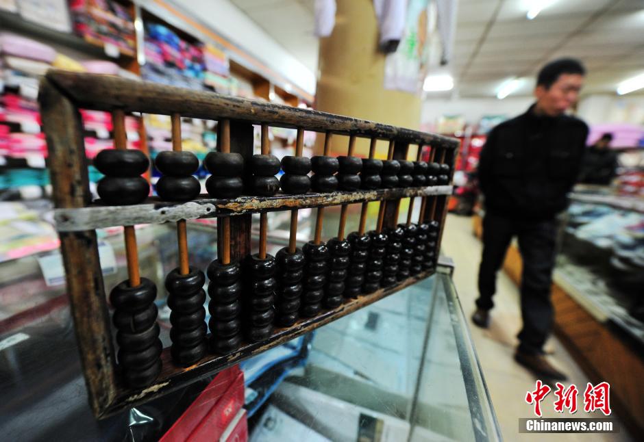 图为福州西湖百货商场一些老员工们仍然在使用算盘算账,使用了30多年的算盘显的有点破旧。中新社发 张斌 摄