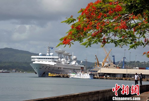 12月8日,漫步南太平洋岛国斐济首都苏瓦街头,绿树红花掩映的海岸边,远远望去,停靠港口的中国远洋航天测量船“远望6号”非常显眼。中新社发 孙自法 摄