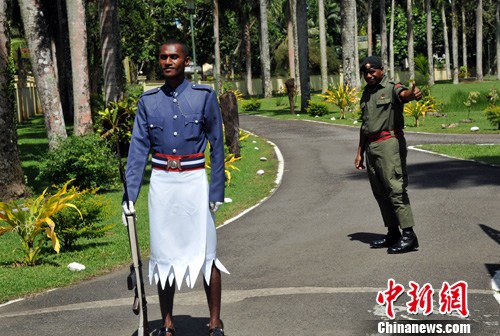 12月8日,漫步南太平洋岛国斐济首都苏瓦街头,总统府大门口的卫兵与警卫,卫兵着斐济传统白裙持枪肃立,现已成为当地一景。中新社发 孙自法 摄