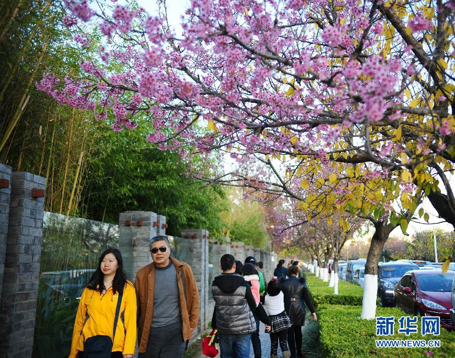12月8日,游人在昆明市红塔西路上观赏冬樱花。 新华社记者 秦朗 摄