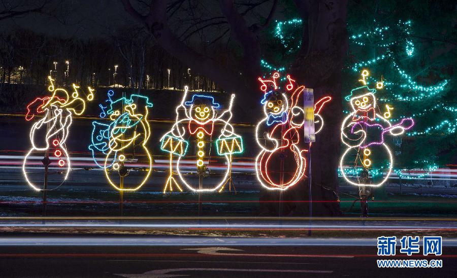 这是12月23日拍摄的加拿大尼亚加拉大瀑布景区的雪人造型彩灯。为迎接圣诞假期,加拿大尼亚加拉大瀑布景区自11月9日起开始举办为期80多天的冬季彩灯节。彩灯为景区增添了浓郁的圣诞节气息。新华社发(邹峥摄)