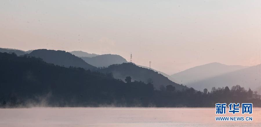 晨曦中的泸沽湖湖面和远山相映成趣(12月26日摄)。