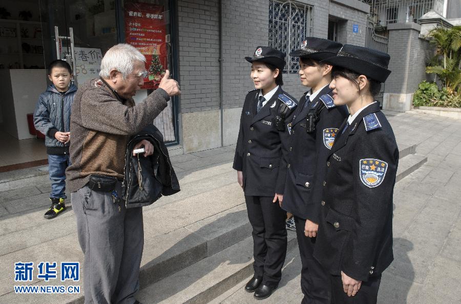 1月21日,福州市鼓楼区城管女子中队的文明执法让一位老大爷向她们竖起大拇指。近日,在福州市鼓楼区三坊七巷、元帅路、通湖路等街区路段,一支新组建的城管女子中队现身街头,对占道经营、乱停车、乱倒垃圾等不文明现象进行耐心劝说、文明劝导。这支由8人组成的福州市鼓楼区城管女子中队成立于2013年9月,其中7人为福建警察学院公安学类专业的本科毕业生。女子城管队员的文明、微笑、柔性执法方式改变了市民对城管执法“简单、生硬”的印象,受到市民的支持与好评。新华社记者姜克红摄