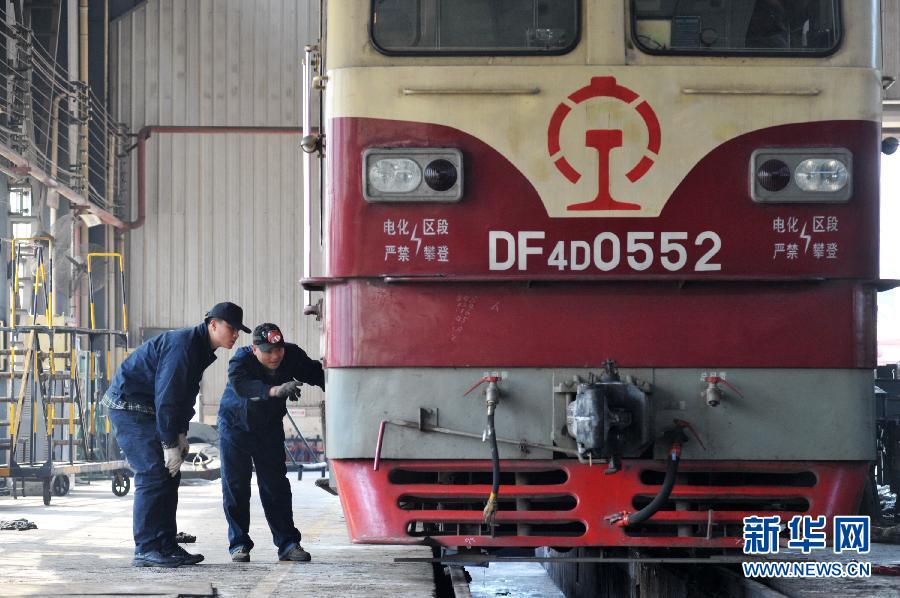 1月21日,在湖南长沙,工作人员对一台火车头进行检修。连日来,长沙机务段对全段承担春运客运牵引任务的上百台火车头逐一进行全面“体检”,消除故障隐患,确保春运期间列车安全运行。新华社记者龙弘涛摄